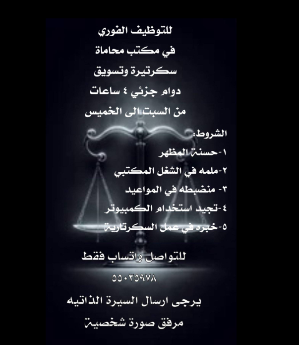 مطلوب سكرتيرة وتسويق لمكتب محاماة بدوام جزئي